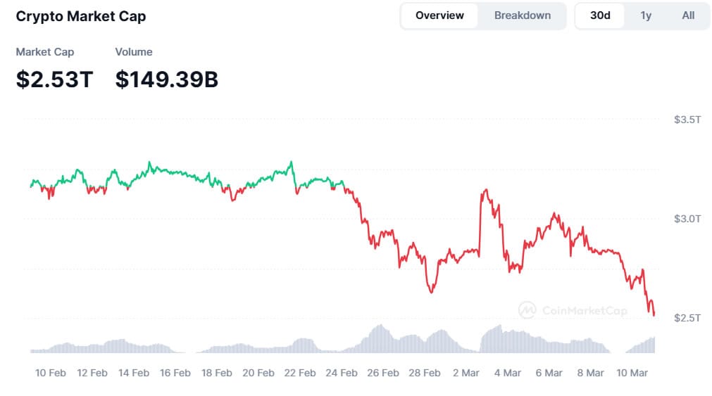 Цены на Solana (SOL) также сильно упали в последние недели, снизившись на 58% с их исторического максимума в $293 в середине января. Актив подешевел еще на 5% в течение дня и торговался по $122 на момент написания.