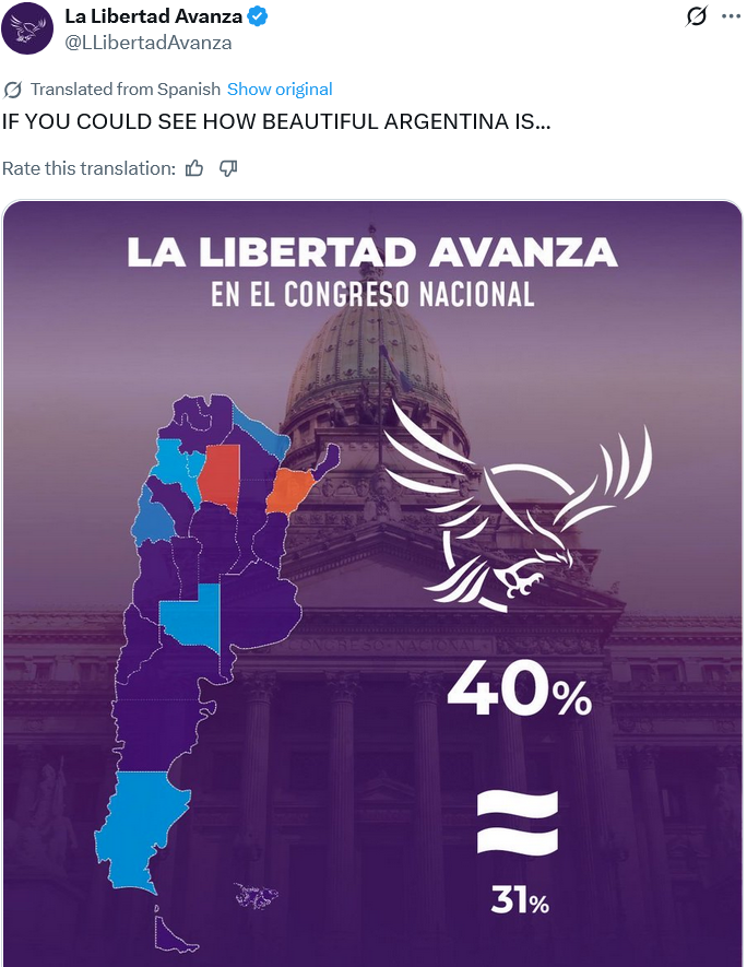 По данным местного новостного издания La Nacion, партия Милейи La Libertad Avanza получила 40,68% голосов при подсчете почти 99% бюллетеней, одержав победу над перонистской партией. В том числе, они победили в провинции Буэнос-Айрес, которая исторически поддерживала перонистов.
