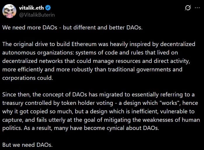 Сооснователь Ethereum Виталик Бутерин призвал пересмотреть подход к созданию децентрализованных автономных организаций (DAO), заявив, что многие из них фактически превратились в казначейства с голосованием токенами.
