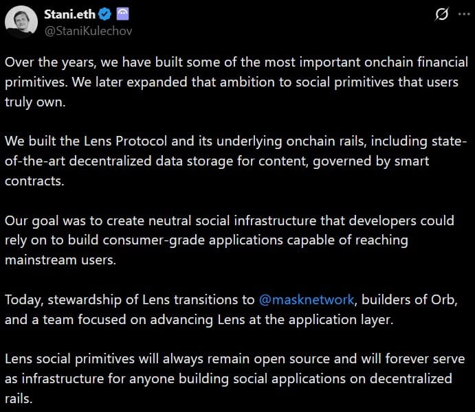 В рамках перехода Mask Network будет отвечать за пользовательские продукты и развитие социальных приложений на базе Lens, при этом базовая инфраструктура протокола остается разрешительной по доступу и с открытым исходным кодом.
