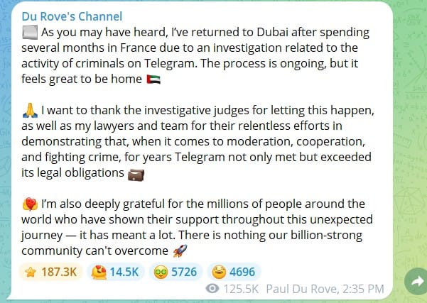 Павел Дуров поделился сообщением в Telegram после возвращения в Дубай. Источник: Павел Дуров