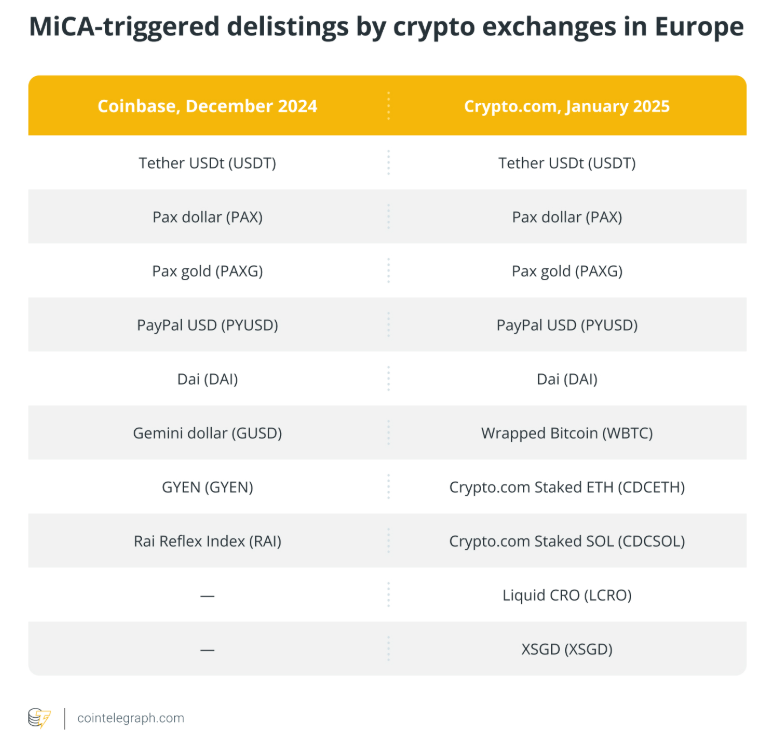 С тех пор как MiCA полностью вступил в силу в декабре 2024 года, несколько поставщиков криптоуслуг в ЕС, включая Crypto.com и Coinbase, объявили о делистинге стейблкоинов Paxos, таких как Pax dollar (PAX) и Pax gold (PAXG).