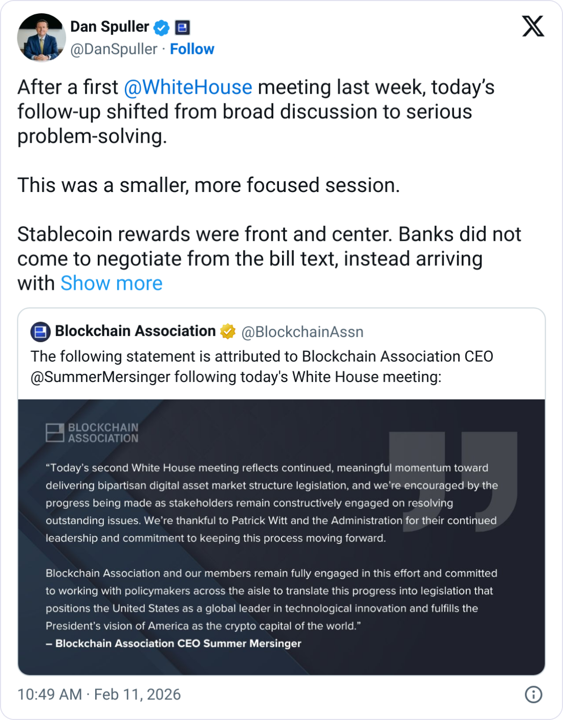 Встреча во вторник стала второй за две недели, когда Белый дом собирал банки и криптоиндустрию для обсуждения. Представитель криптоассоциации Blockchain Association Дэн Спуллер отметил в X, что последняя встреча была «меньшей и более сфокусированной» и прошла в формате «серьезного поиска решений».