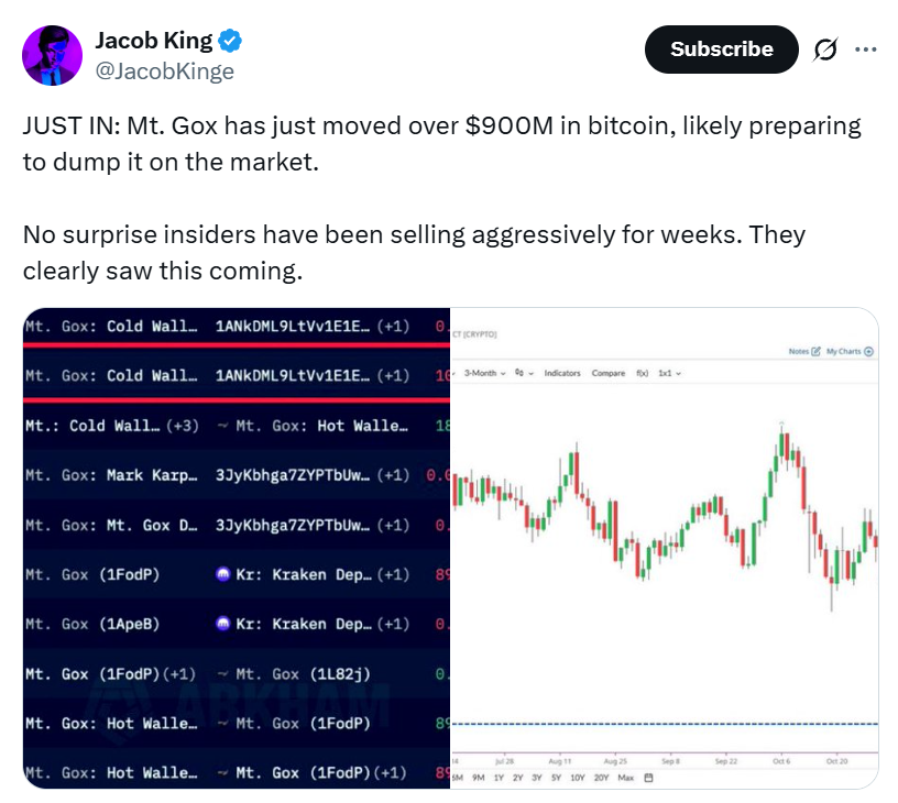 «Mt. Gox только что переместила более $900 млн в биткоинах, вероятно, готовясь сбросить их на рынок», — написал Джейкоб Кинг, финансовый аналитик и генеральный директор SwanDesk, в своем посте на платформе X.