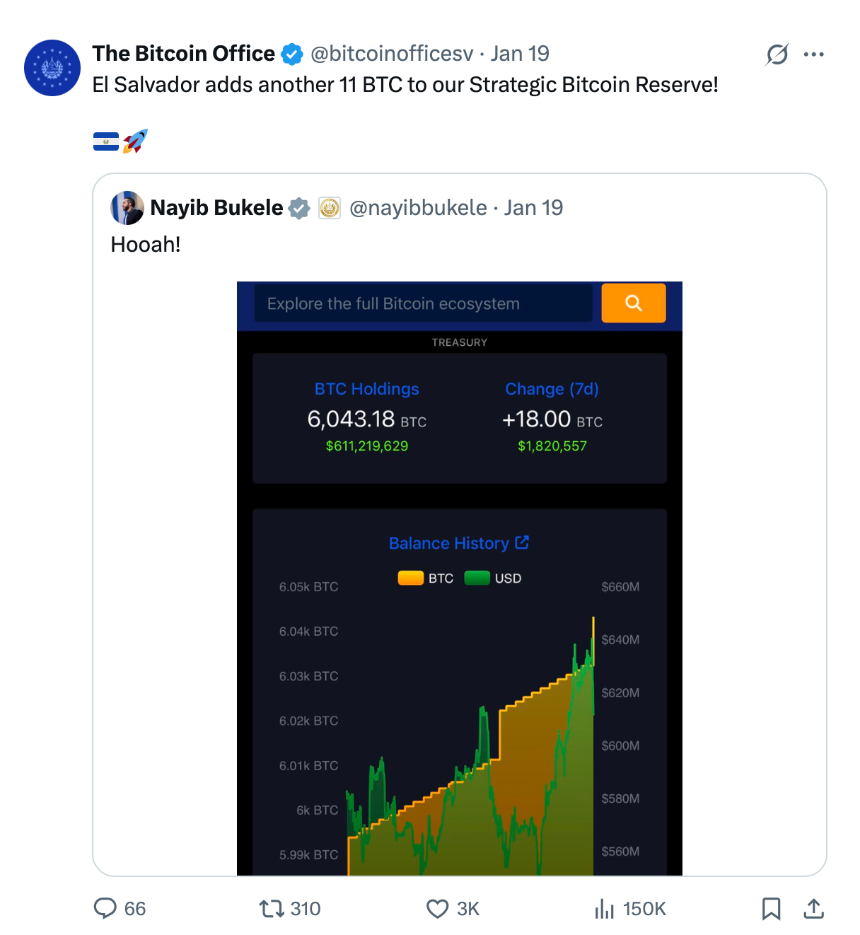 Несмотря на это, веб-сайт офиса Биткоина в Сальвадоре продолжает демонстрировать записи о регулярных покупках Биткоина правительством, с общими запасами в 6,374 BTC, стоимостью около $654.8 миллиона на момент написания.