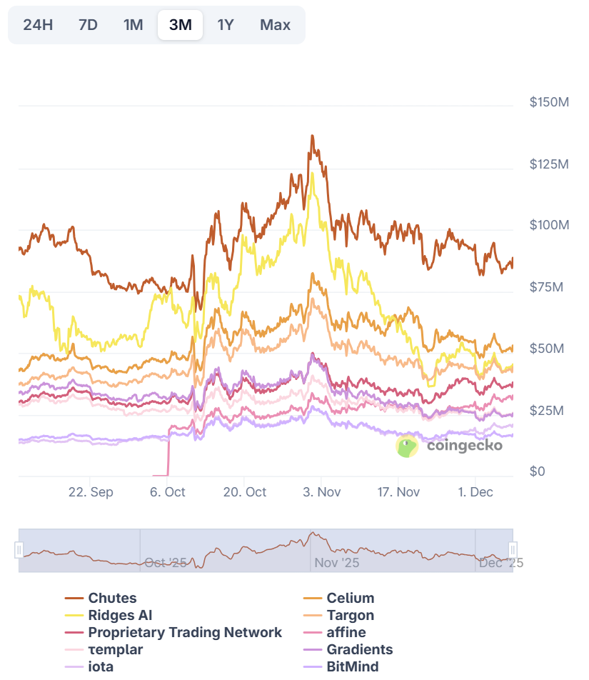 В любом случае, согласно Grayscale Research, оценки подсетей значительно выросли с момента их запуска. К крупнейшим из них относятся Chutes, предоставляющий серверные вычисления для AI моделей, и Ridges, подсеть, сосредоточенная на краудсорсинге разработки AI агентов.