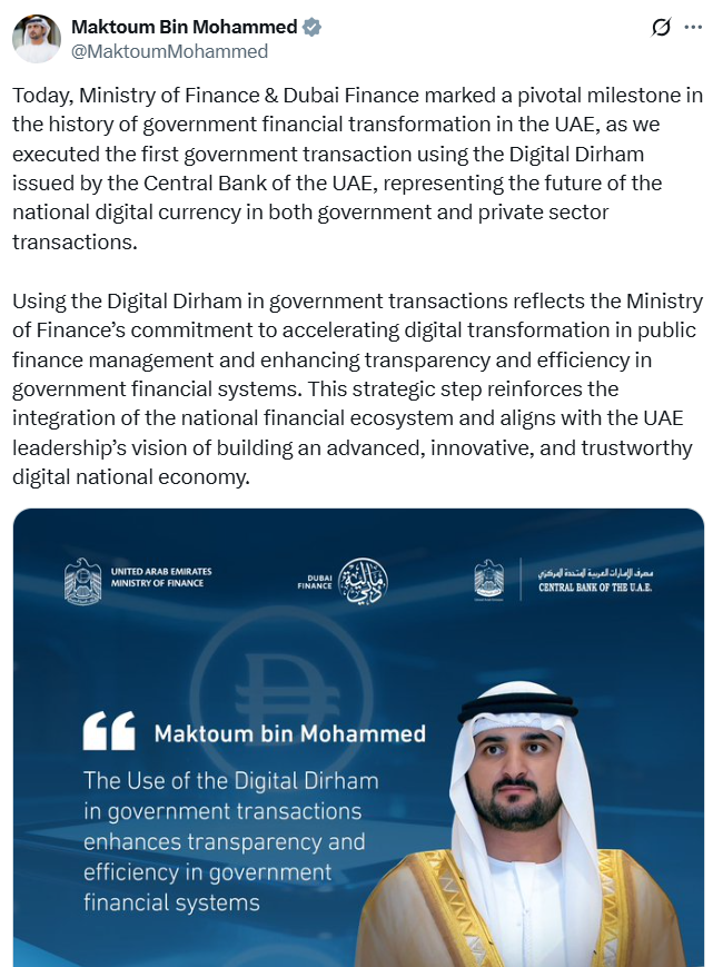 Министерство финансов ОАЭ и Финансовое управление Дубая заявили во вторник, что эта транзакция является частью пилотной фазы проекта "Цифровой дирхам" и использует государственную платежную платформу mBridge.