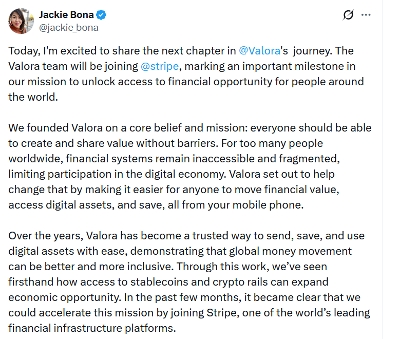 По словам генерального директора Valora Джеки Бона, в результате сделки команда Valora присоединится к Stripe и будет работать над блокчейн-инициативами компании.