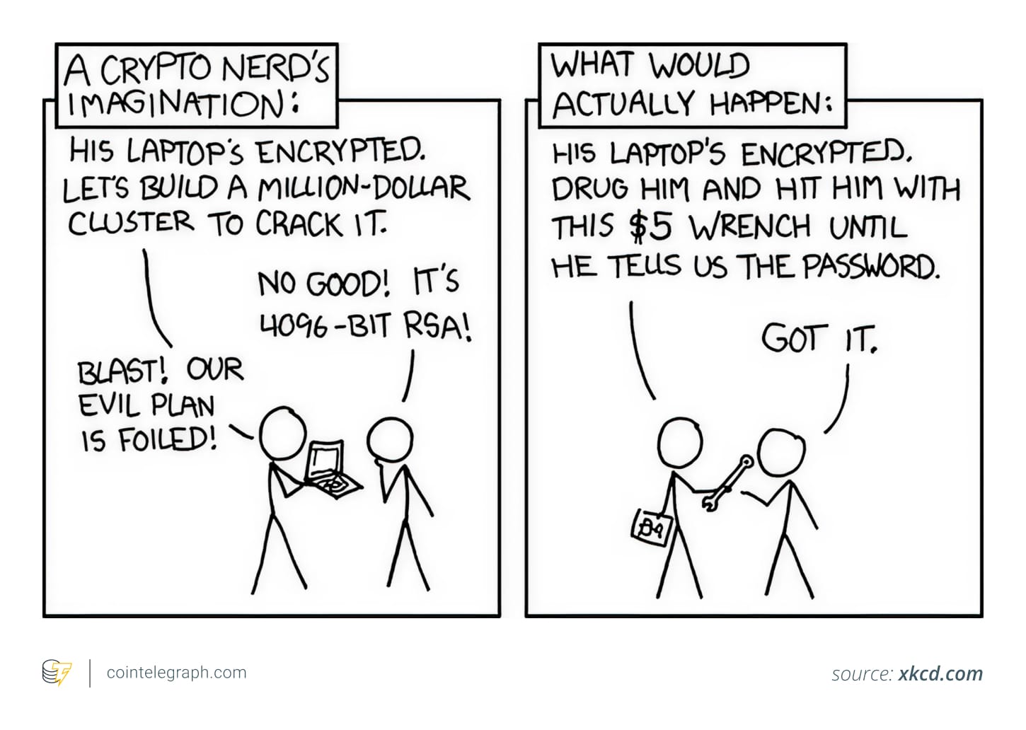 Термин происходит из известного комикса Xkcd. Когда шифрование достаточно сильное, кратчайший путь — это принуждение, например, удар гаечным ключом. Термин закрепился, потому что он точно описывает суть таких инцидентов, отличающихся от большинства краж криптовалют. Взломщику не нужны уязвимости, только близость и рычаг давления на повседневную жизнь человека.