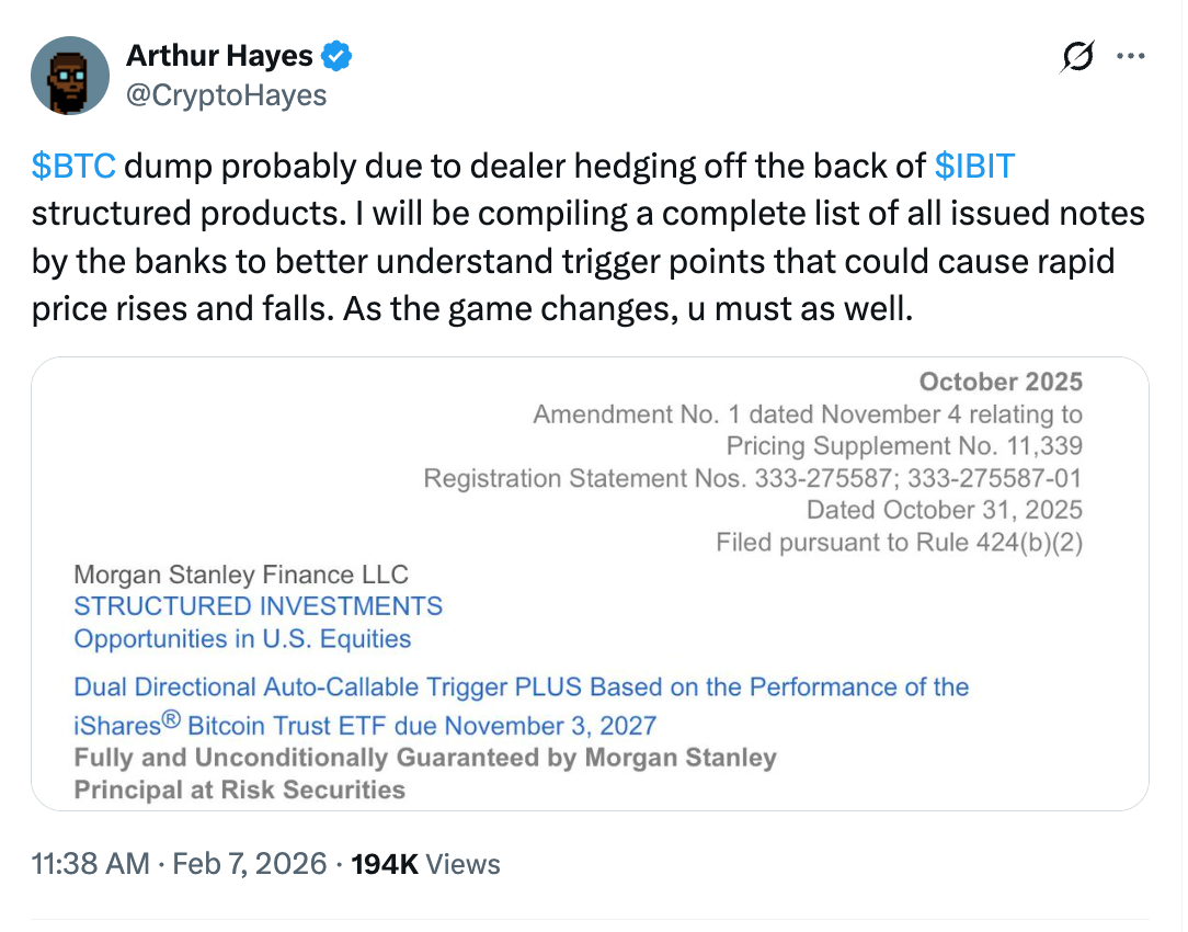Он предположил, что банки, включая Morgan Stanley, могли быть вынуждены продавать Bitcoin (или связанные инструменты), чтобы хеджировать риск по структурным нотам, привязанным к спотовым биткоин-ETF, таким как BlackRock IBIT.