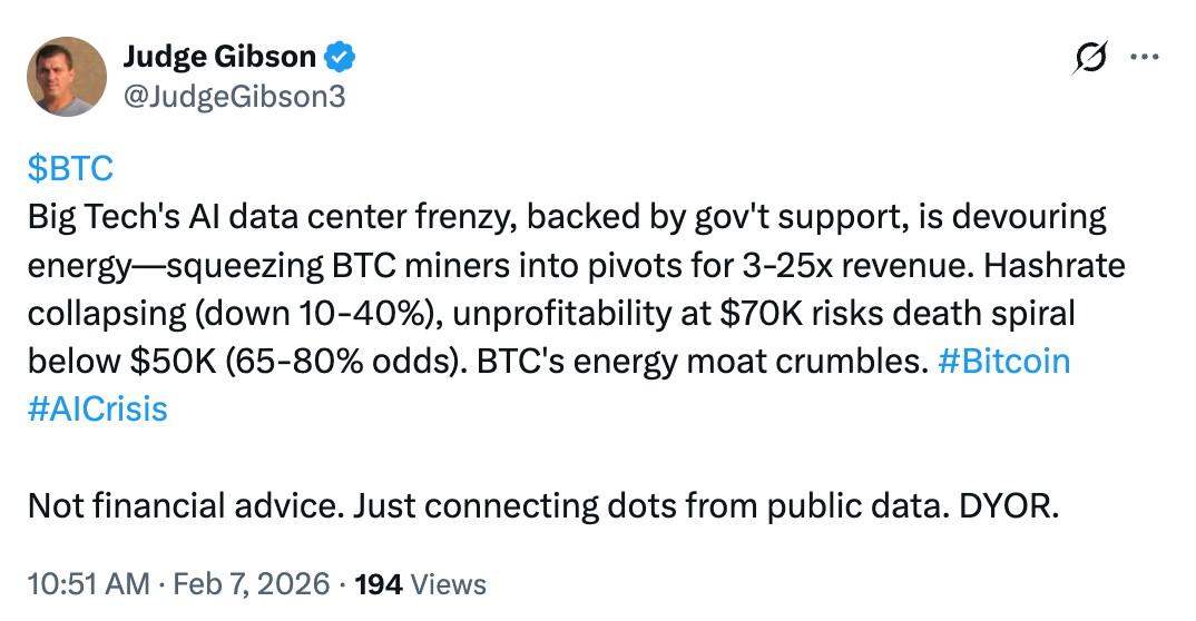 Аналитик Judge Gibson написал в X, что рост спроса на дата-центры для ИИ уже вынуждает майнеров менять стратегию, что якобы привело к снижению хешрейта на 10–40%.