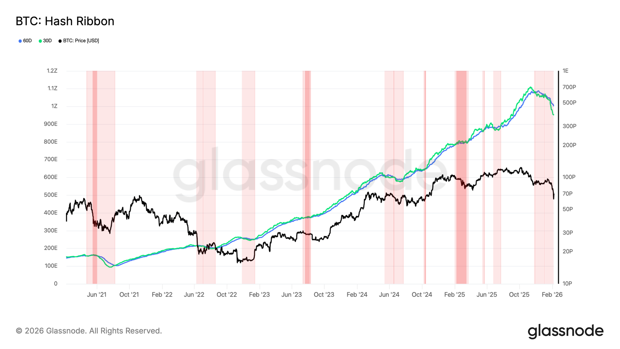 Дополнительно на риск указывает индикатор Hash Ribbons: 30-дневная средняя хешрейта опустилась ниже 60-дневной. Исторически такая инверсия сигнализирует о сильном давлении на доходы майнеров и повышает вероятность капитуляции.
