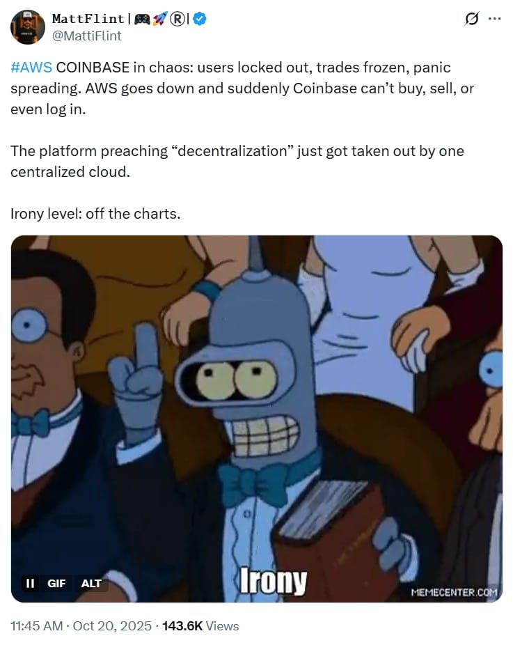 Эта зависимость обычно невидима для пользователей, но становится очевидной, когда AWS перестает работать. Во время сбоя AWS 20 октября пользователи Coinbase сообщали о проблемах с входом в систему, размещением сделок и выводом средств. Трейдеры Robinhood наблюдали задержки и ошибки API.