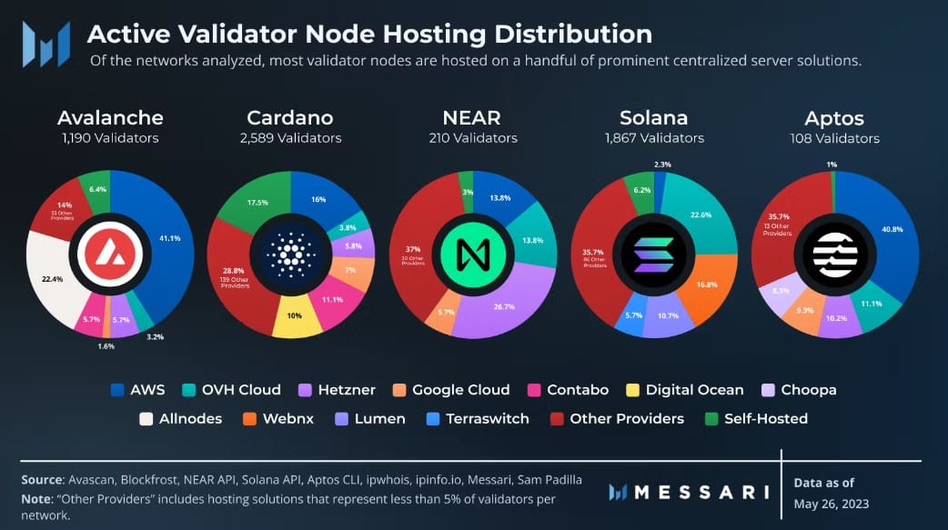 Исследование, представленное на симпозиуме безопасности Usenix в августе, выявило Amazon Web Services как крупнейшего хостинг-провайдера среди валидаторов Ethereum, что составляет примерно одного из пяти. Отдельно, анализ Messari в 2023 году обнаружил, что большинство валидаторов и хостинг-операторов используют централизованные серверы.