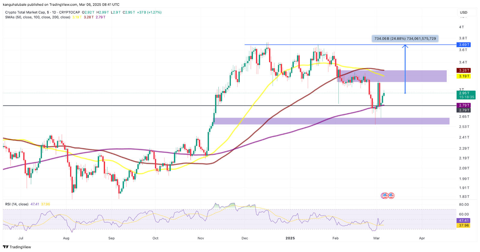 Общая рыночная капитализация, в настоящее время находящаяся на уровне 2,95 триллиона долларов, стремится преодолеть зону сопротивления между 3,1 триллиона и 3,28 триллиона долларов, где находятся 100-дневная и 50-дневная SMA.