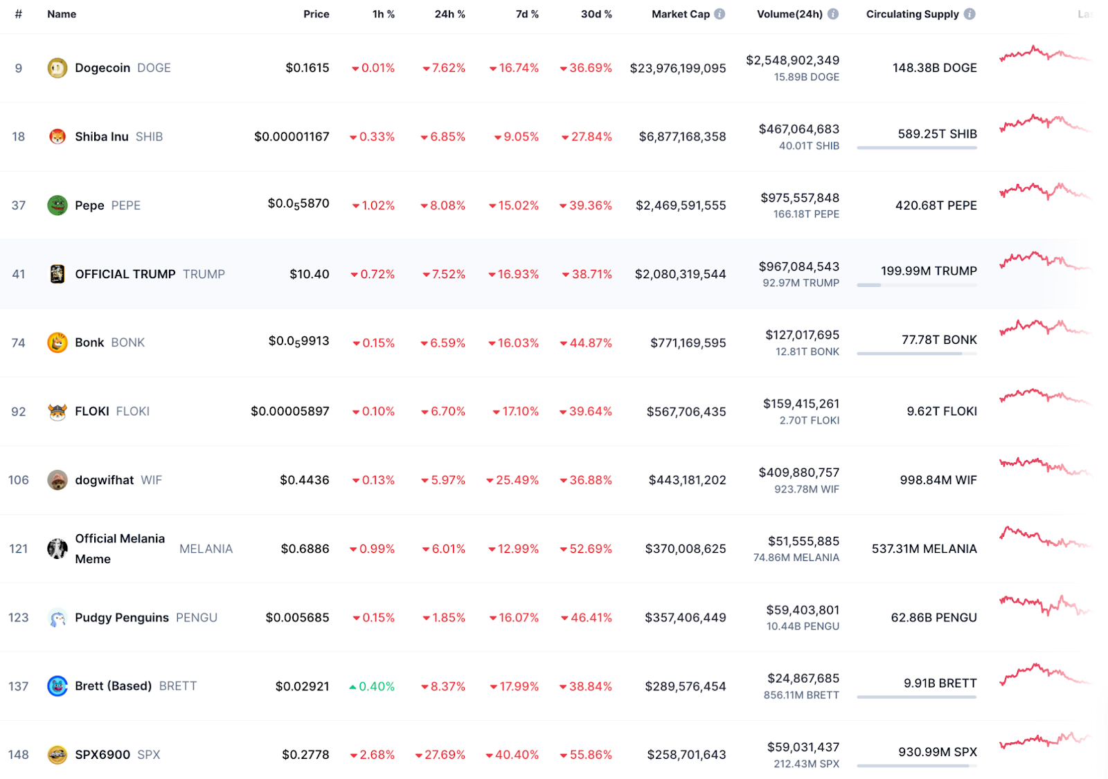 - Solana-базированный SPX6900 (SPX) зарегистрировал наибольшие потери среди крупнейших мемкриптовалют, упав на 28%.