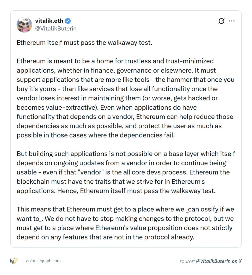 Тест Бутерина "тест отступления" прост. Может ли Ethereum выполнить свое основное обещание как платформа для доверительных и минимизирующих доверие приложений без зависимости от постоянных изменений протокола, чтобы оставаться жизнеспособным?