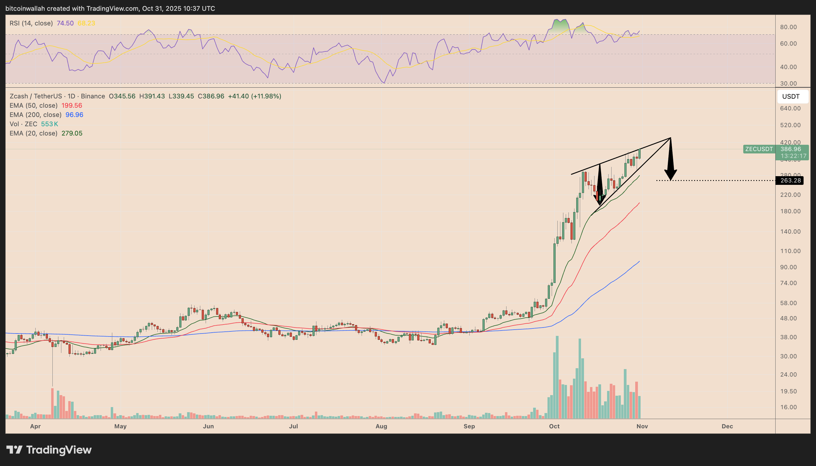 Этот паттерн может подтвердить снижение на 30% к зоне $260–$270 в ноябре, если продавцы смогут протолкнуть ZEC ниже нижней границы клина.