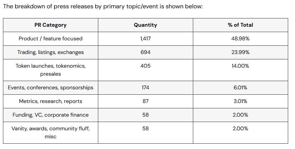 Пресс-релизы предназначены для донесения до аудитории значимых новостей, однако при использовании как дешевого маркетингового инструмента они могут вытеснять реальную повестку и в отдельных случаях влиять на цену токенов.