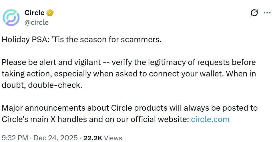 Позднее, в канун Рождества 2025 года, внимание привлек проект, маскировавшийся под эмитента стейблкоина USDC — компанию Circle: через фальшивый пресс-релиз он объявил о запуске новой платформы. Сайт проекта впоследствии отключили, но пока он работал, посетителей побуждали подключать криптокошельки.