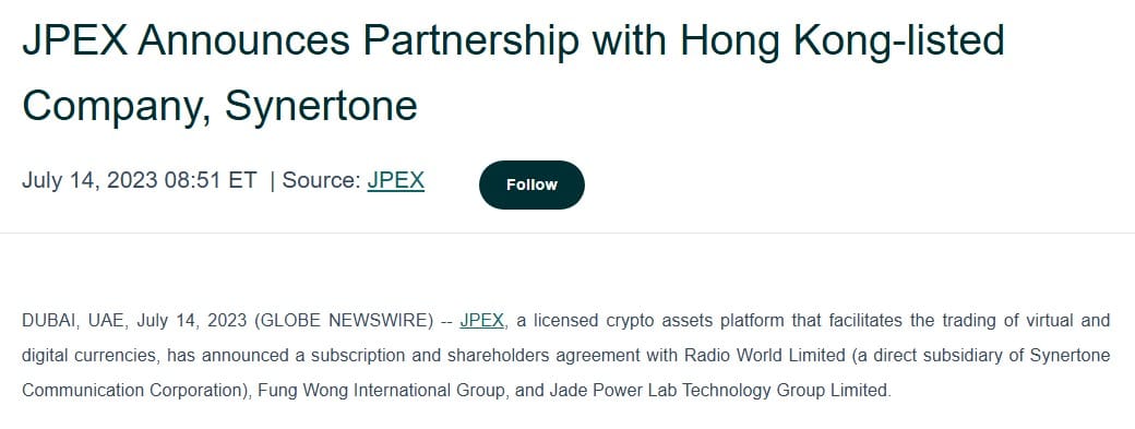 В качестве примера приводится пресс-релиз от июля 2023 года, в котором уже прекратившая работу криптобиржа JPEX объявляла о партнерстве и позиционировала себя как лицензированную торговую платформу.