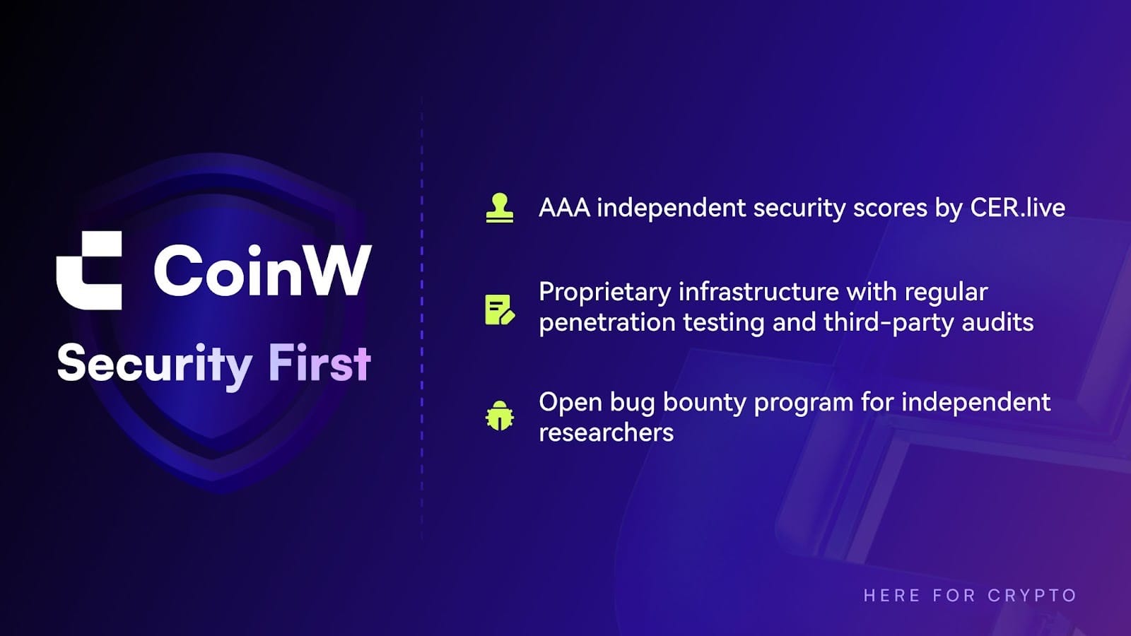 Работая уже восемь лет без публично зарегистрированных крупных нарушений безопасности, влияющих на операционную деятельность платформы, CoinW обеспечила стабильность на фоне рыночных срывов, влияющих на широкий сектор. Эта операционная безопасность была подтверждена внешней проверкой с рейтингом безопасности AAA от CER.live, независимой третьей стороны по оценке безопасности.