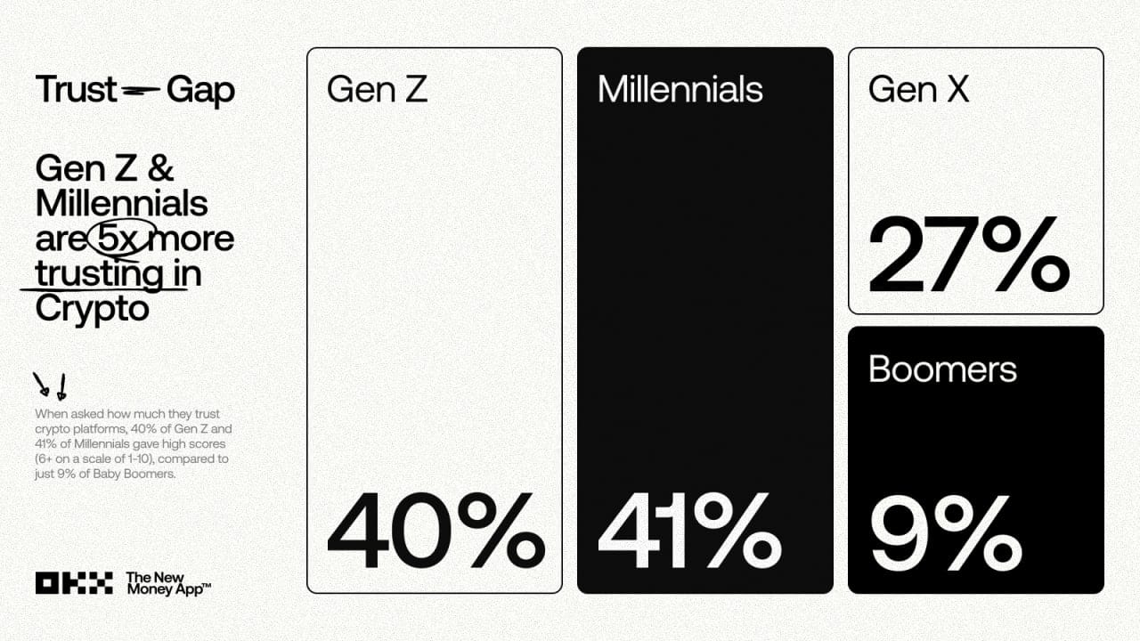 Представитель OKX пояснил, что «разрыв доверия» связан с тем, как разные поколения понимают саму концепцию доверия: бумеры чаще опираются на одобрение институтов и регуляторный надзор, а Gen Z и младшие миллениалы больше ценят проверяемость, прозрачность и прямой контроль.