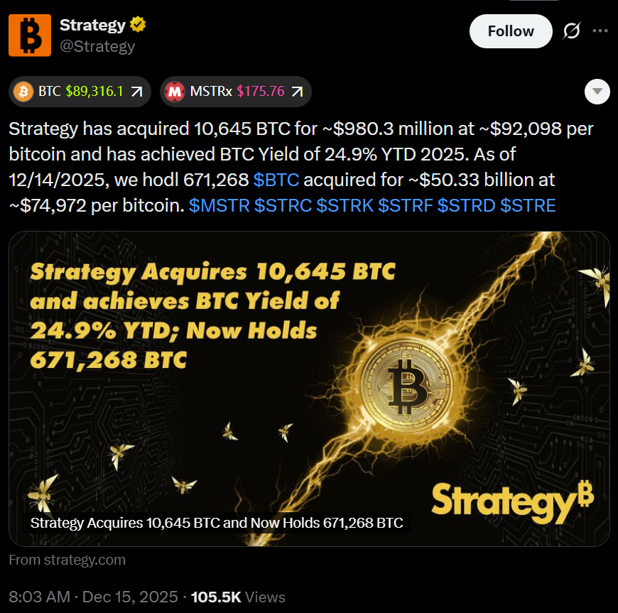 Strategy объявила в понедельник, что приобрела 10 645 биткоинов (BTC) на сумму $980,3 млн, заплатив в среднем $92 098 за монету.