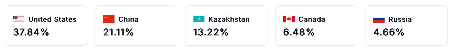 После запрета майнинга Bitcoin в 2021 году в Китае большая часть мощностей индустрии переместилась в США, которые теперь составляют примерно 37% глобального хешрейта Bitcoin, что делает их крупнейшим мировым центром майнинга. Шесть из десяти крупнейших публично торгуемых майнинговых компаний базируются в США.