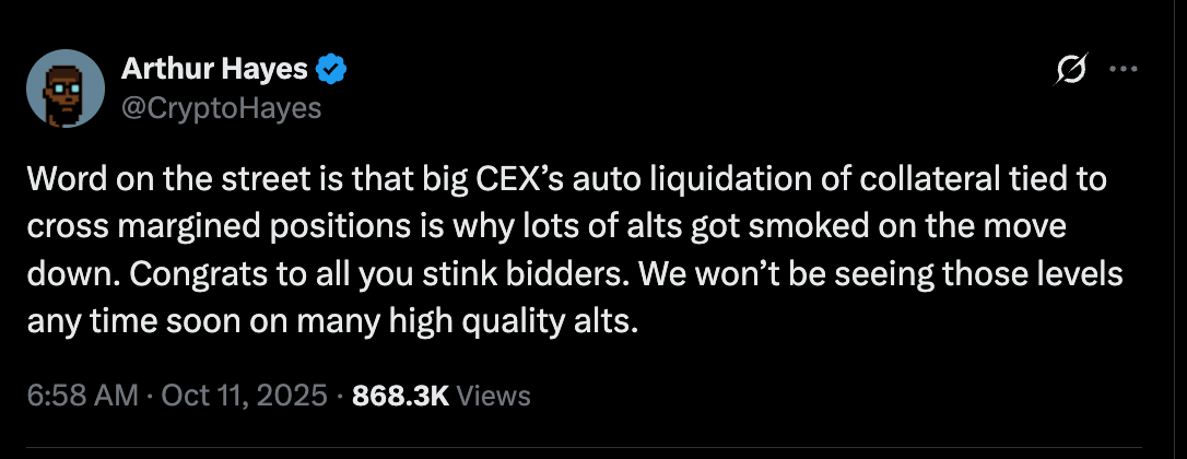 Сооснователь BitMEX Артур Хейс сообщил, что крупные биржи, в том числе Binance, «ликвидировали залоговые активы, связанные с перекрестными маржинальными позициями», что усилило распродажу.