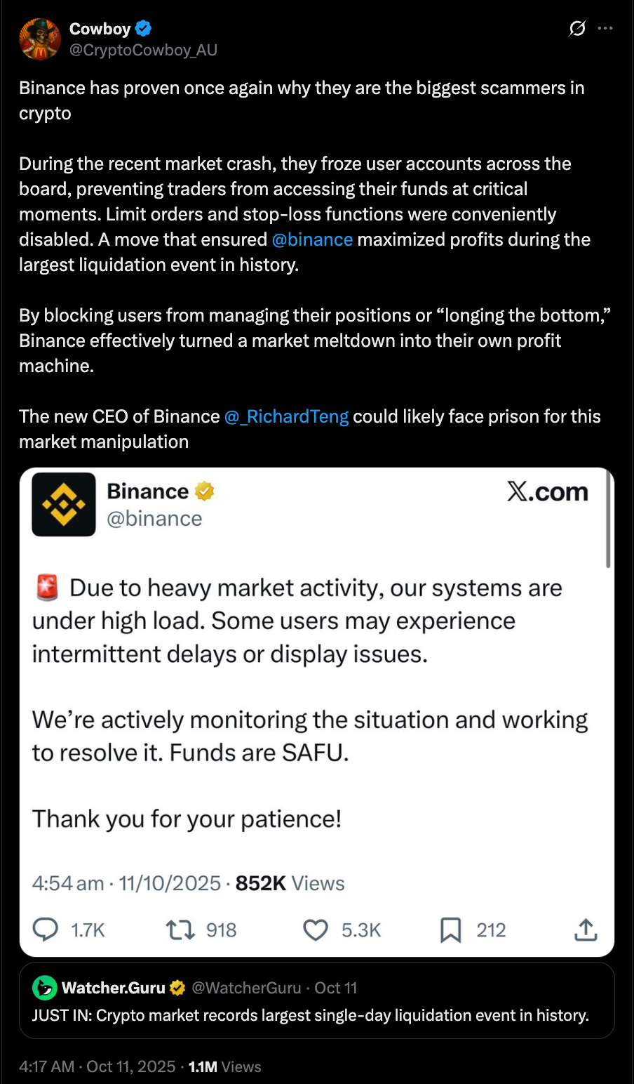 По мере обвала цен торговые системы Binance перегружались. Некоторые пользователи сообщили о замороженных аккаунтах, несработавших стоп-лоссах и задержках в исполнении сделок.