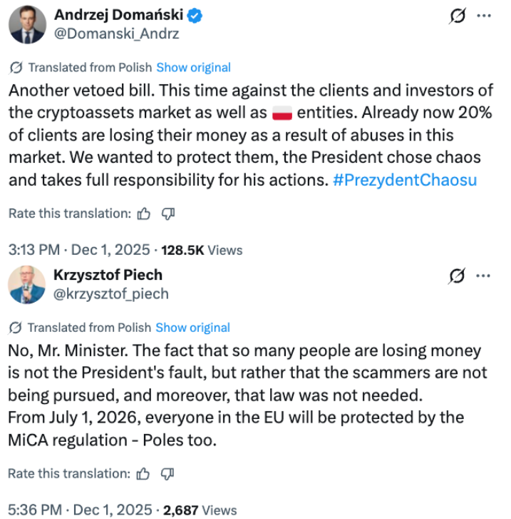 Сикорский поддержал эту озабоченность, заявив, что законопроект должен был регулировать криптовалютный рынок. "Когда пузырь лопнет и тысячи поляков потеряют свои сбережения, по крайней мере, они будут знать, кому благодарить," - аргументировал Сикорский на X.