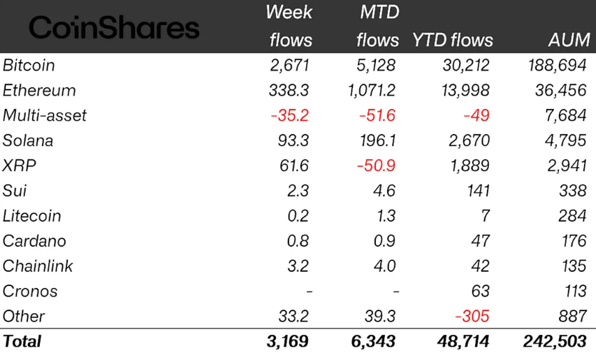 Фонды Биткоина (BTC) лидировали по притоку, составив $2,7 миллиарда за неделю, что привело к новому рекорду в $30,2 миллиарда с начала года, но все еще примерно на 30% ниже от общего объема прошлого года в $41,7 миллиарда.