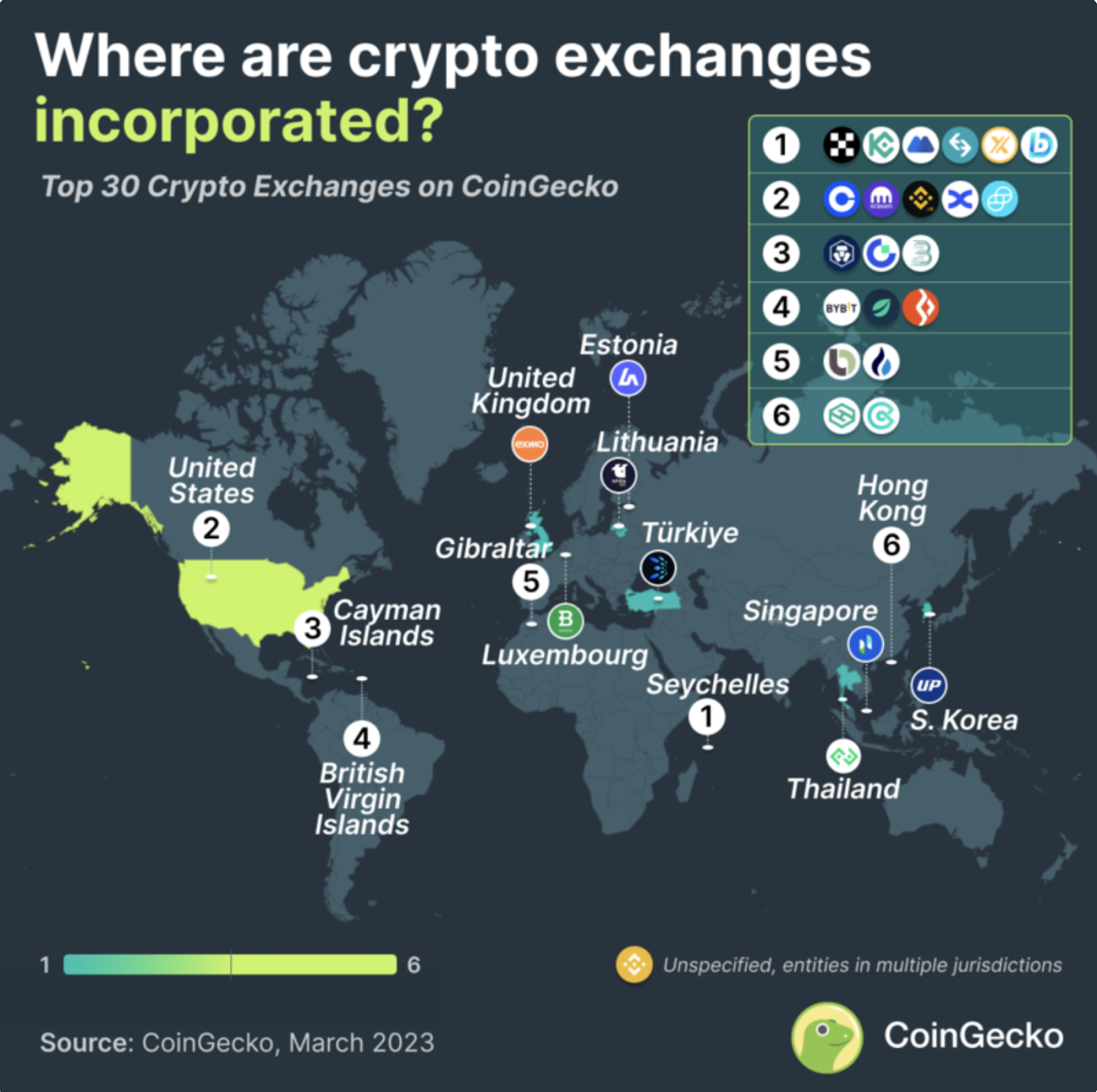 Несколько криптобирж были зарегистрированы в более дружелюбных юрисдикциях в 2023 году. Источник: CoinGecko