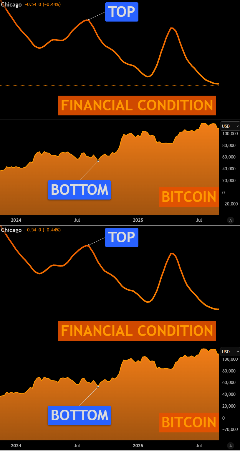 Этот сигнал появился в конце 2022 года и середине 2024 года, обеим фазы предшествовали резким ралли. Исторически каждое снижение на 0.10 пункта совпадало с ростом биткоина примерно на 15%–20%, а более глубокие значения NFCI отмечали продолжительные фазы подъема BTC.