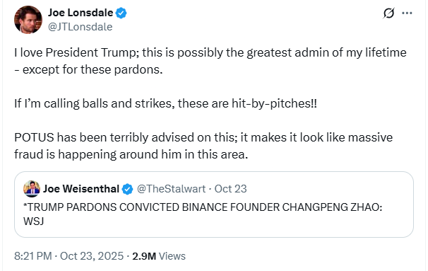 Это вызывает еще большее беспокойство в случае помилования Чжао. Binance, большая часть которой, по сообщениям, все еще принадлежит Чжао, была значительным инвестором в криптопроект Трампа, World Liberty Financial. По данным New Yorker, биржа лоббировала адвокатов, связанных с Трампом, чтобы обеспечить помилование. Соучредитель Palantir Джо Лонсдейл заявил: