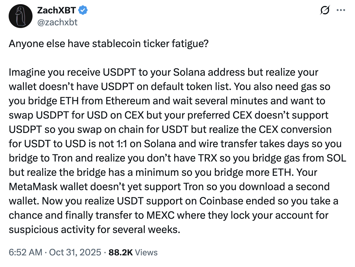 Разнообразие тикеров стейблкоинов и стандартов токенов ведет к рассеиванию ликвидности в криптоэкосистеме и приносит пользователям неудобства — это дорого, технично и занимает много времени, по мнению исследователя блокчейна ZachXBT.