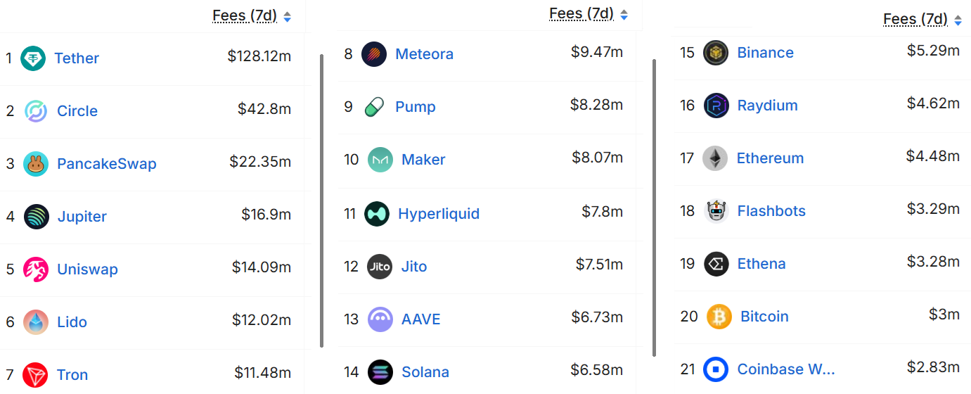 PancakeSwap, которая работает исключительно на BNB Chain, сгенерировала $22,3 млн комиссий за семь дней, обогнав Uniswap, которая функционирует на Ethereum, Base, Arbitrum, Polygon и Optimism. Другие признаки слабости комиссий Ethereum включают отставание Lido от Solana’s Jupiter и AAVE, ведущего протокола кредитования на Ethereum, который генерирует меньше комиссий, чем Meteora, автоматизированный маркет-мейкер и провайдер ликвидности на Solana.