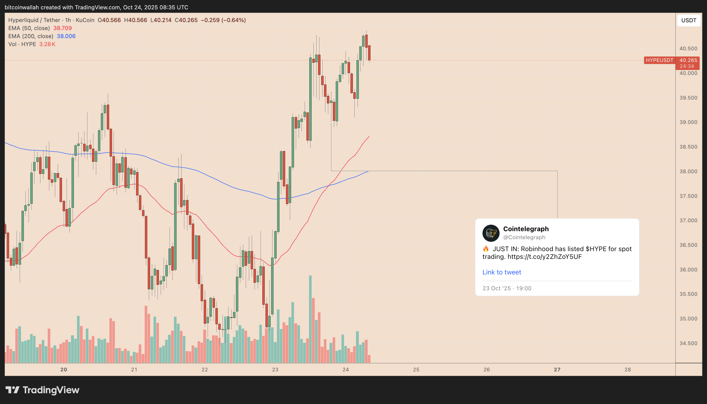 Родной токен децентрализованной биржи Hyperliquid, HYPE, вырос более чем на 13% на следующий день после выхода на американскую торговую платформу Robinhood, достигнув 40.87 доллара в пятницу.