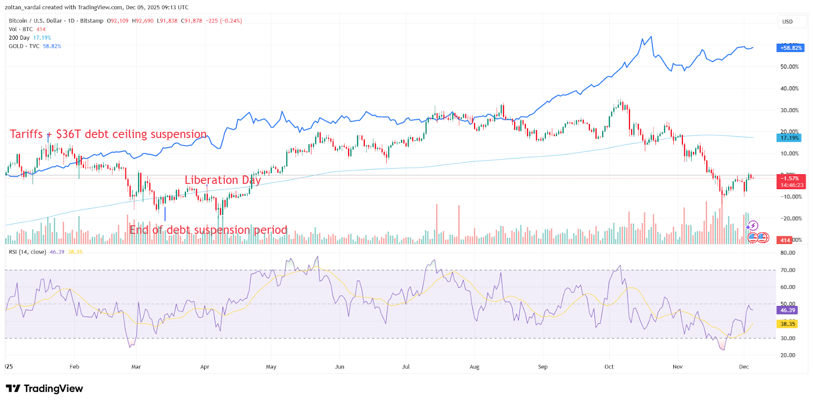 С начала 2025 года цена золота выросла на 58%, обгоняя 1.5% падение Биткоина с начала года, согласно данным TradingView.