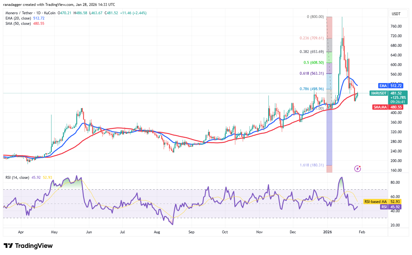 Откат Monero (XMR) встречает сопротивление на 50-дневной SMA ($480), что указывает на продажи при небольших подъемах.