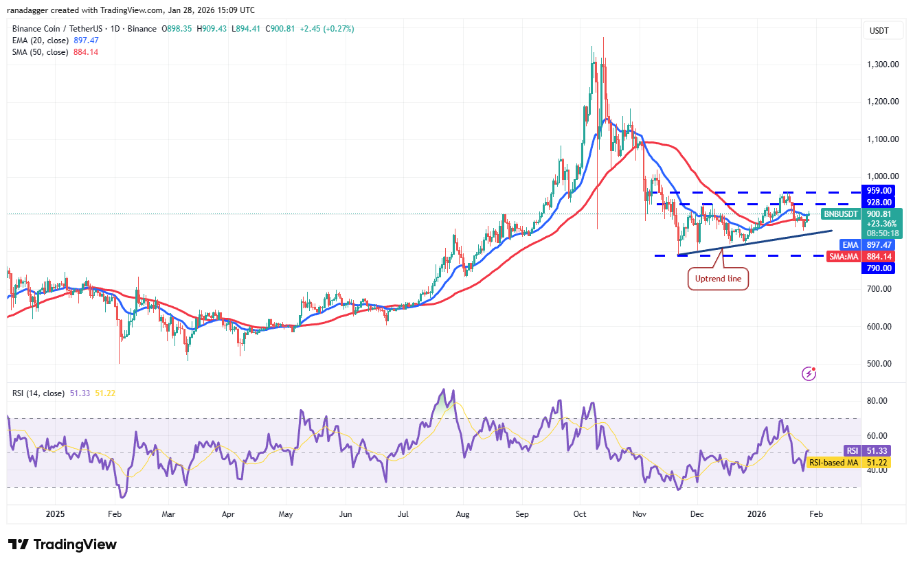BNB пытается подняться выше 20-дневной EMA ($897), что указывает на спрос на более низких уровнях.