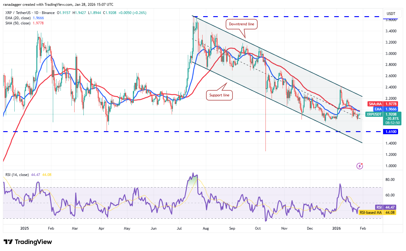 Продавцы постараются опустить цену ниже $1,77. Если это удастся, XRP/USDT может снизиться к важной поддержке $1,61. Ожидается, что покупатели будут активно оборонять область между линией поддержки нисходящего канала и уровнем $1,61.