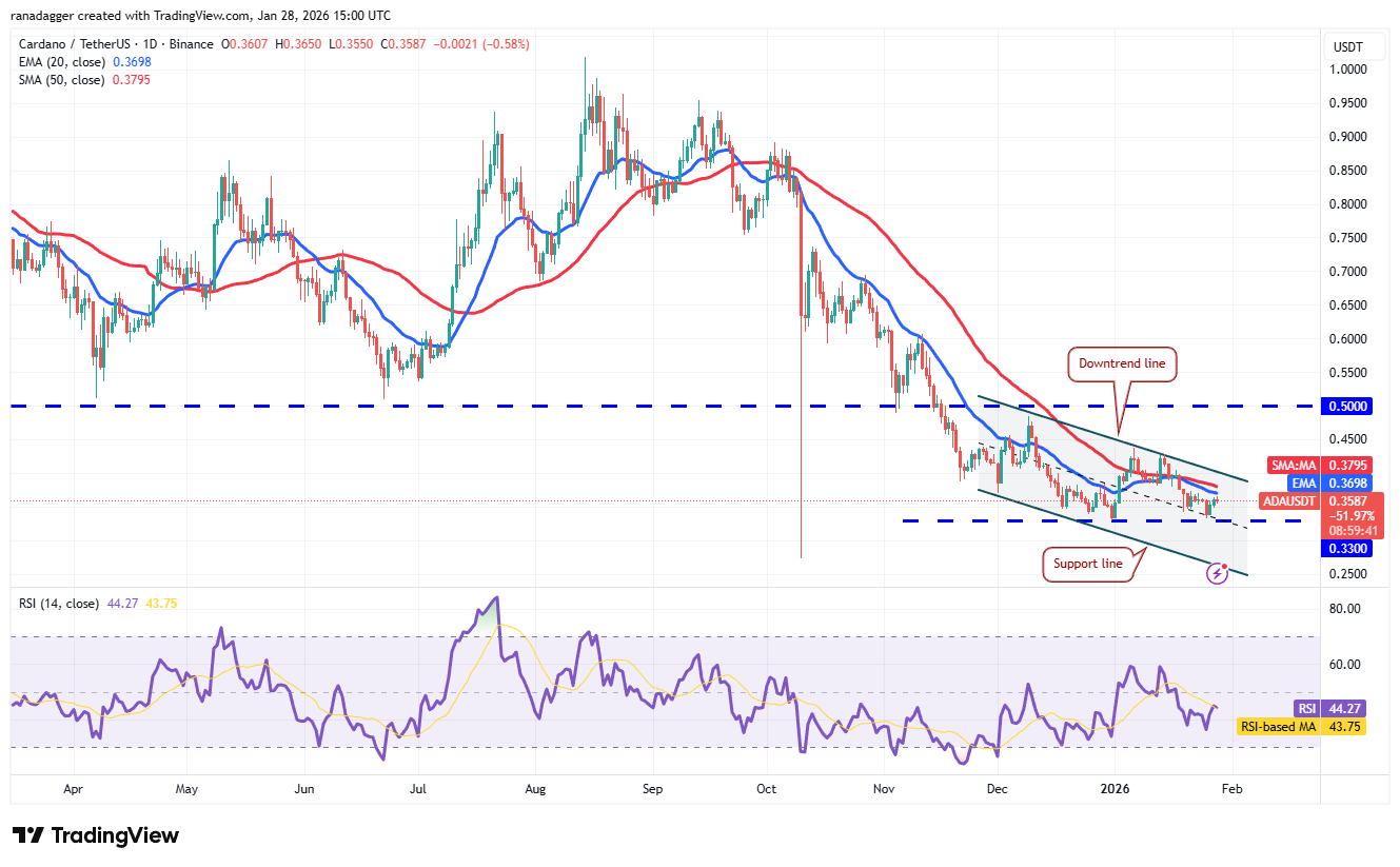 Отскок Cardano (ADA) от уровня $0,33 дошел до скользящих средних, где продавцы, вероятно, активизируются.