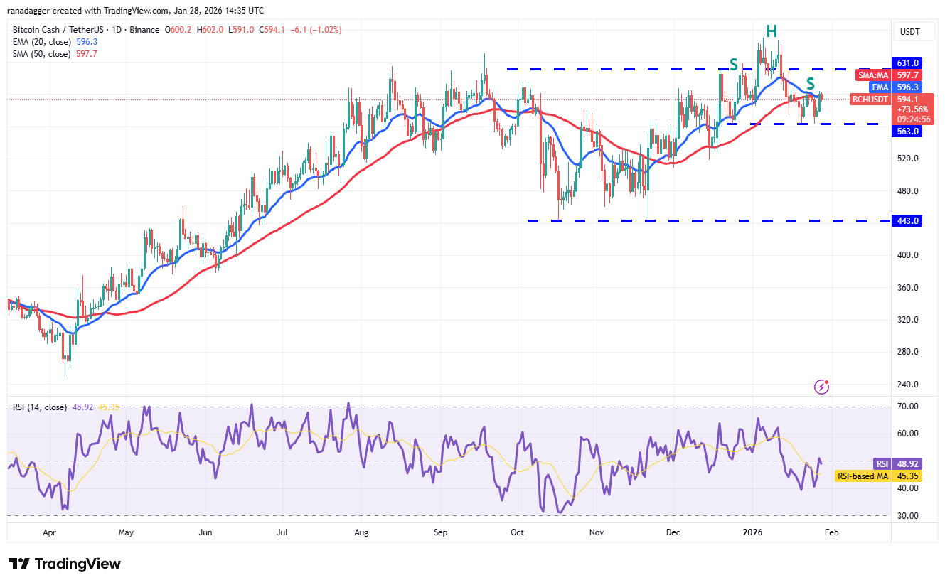 Скользящие средние выравниваются, а RSI находится около середины, что указывает на баланс спроса и предложения. Если цена поднимется выше скользящих средних, преимущество перейдет к покупателям, и BCH/USDT может вырасти к $631, а затем — к $670.