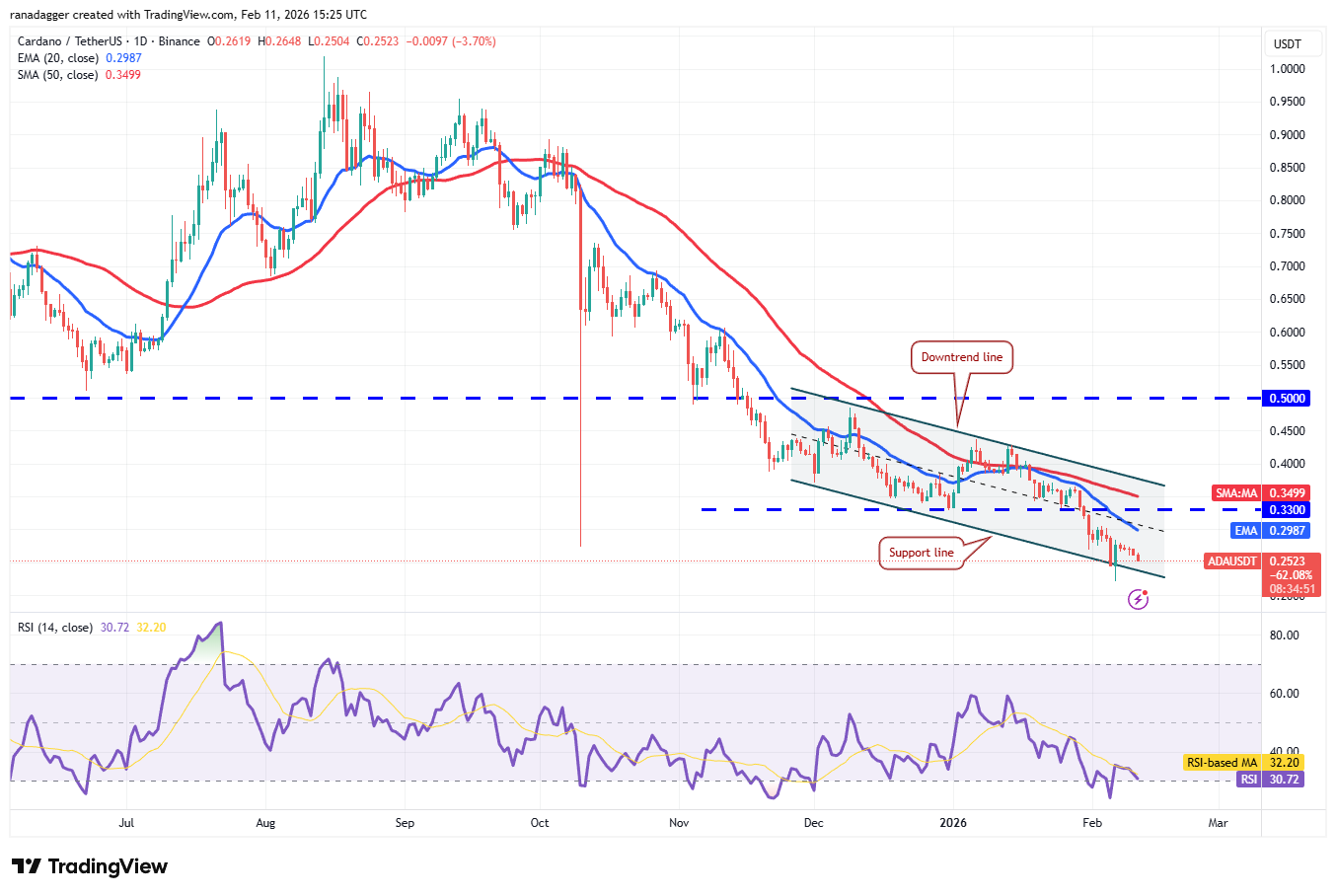 Cardano (ADA) постепенно снижается к линии поддержки нисходящего канала — давление продавцов сохраняется.