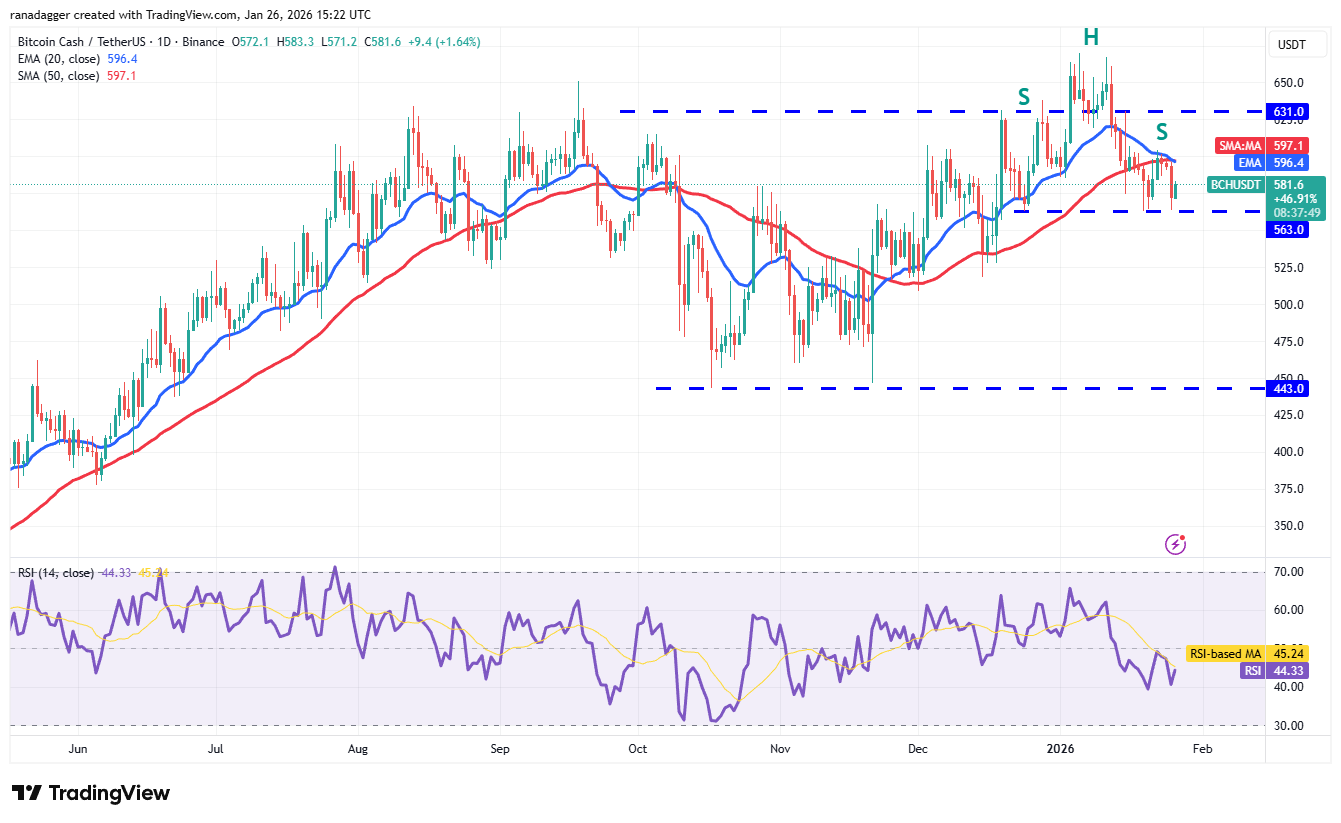 В воскресенье Bitcoin Cash (BCH) резко развернулся вниз от 20-дневной EMA ($596), но позитивный момент — покупатели удержали уровень $563.