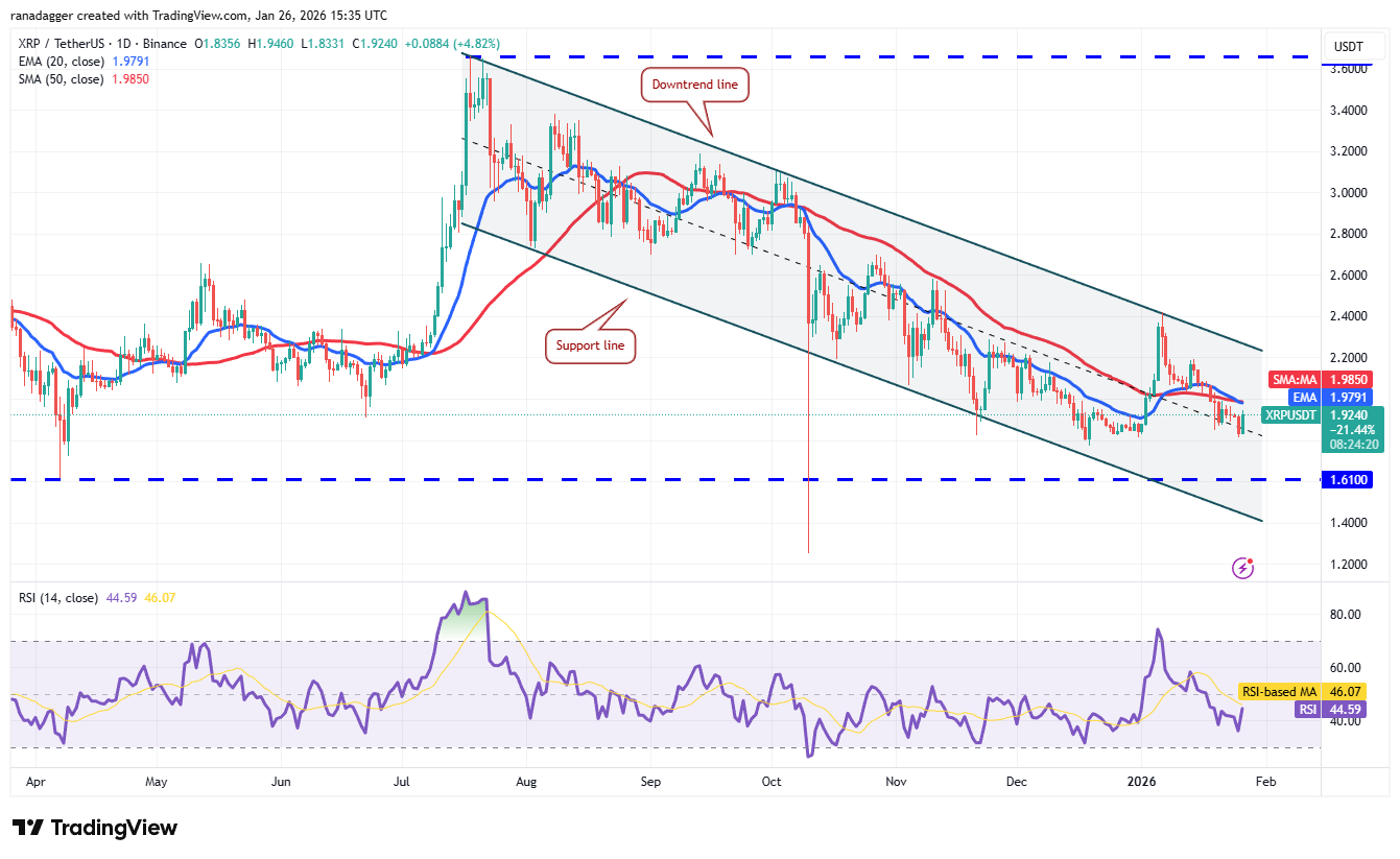 Поддержка находится у $1,81, однако отскок, вероятно, встретит продажи у 20-дневной EMA ($1,97). Если цена резко пойдет вниз от 20-дневной EMA, пара XRP/USDT может упасть к сильной поддержке $1,61.