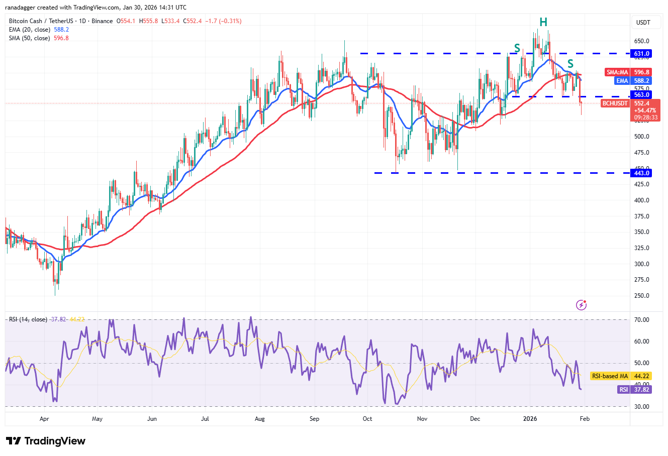 Bitcoin Cash (BCH) в четверг резко опустился ниже поддержки $563, завершив формирование медвежьей модели «голова и плечи».