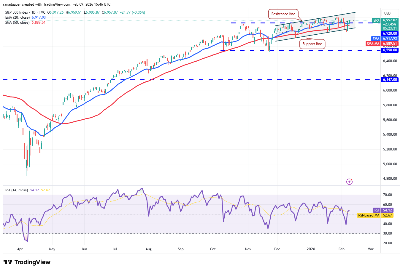 20-дневная EMA (6 917) выравнивается, а RSI находится чуть выше середины, что сигнализирует о балансе спроса и предложения. Закрепление выше линии сопротивления может открыть путь к следующей волне роста в направлении 7 290.